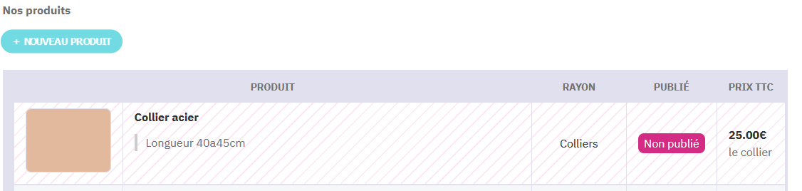 Tous les produits qui ne sont pas publiés apparaissent hachurés