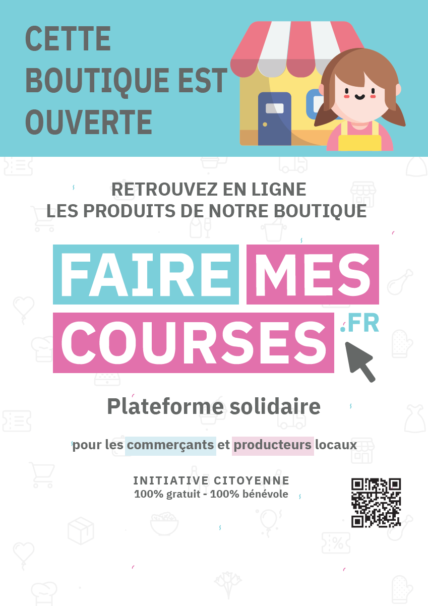 Cette affiche a été crée de manière spontanée par deux personnes de la Provence Alpe Côte d'Azur, qui nous ont fait et qui vous ont fait ce cadeau ! Belle initiative. MERCI 🤗 Le QRcode permet au client d'aller sur la page d'accueil du site Faire-Mes-Courses.fr, via son smartphone.
