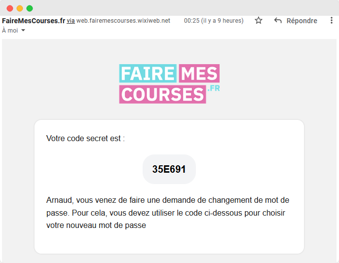 - Vous recevez un code secret par email, il va permettre de vous identifier pour changer votre mot de passe