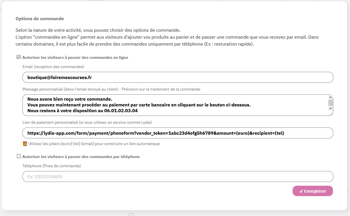 Concrètement, en faisant cette manipulation, la plateforme remplacera {euro} par le montant de la commande, et {tel} par le numéro de téléphone.
