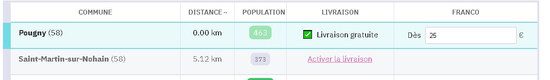 Cliquez dessus pour activer la livraison pour cette commune. (par défaut les livraisons sont désactivées)